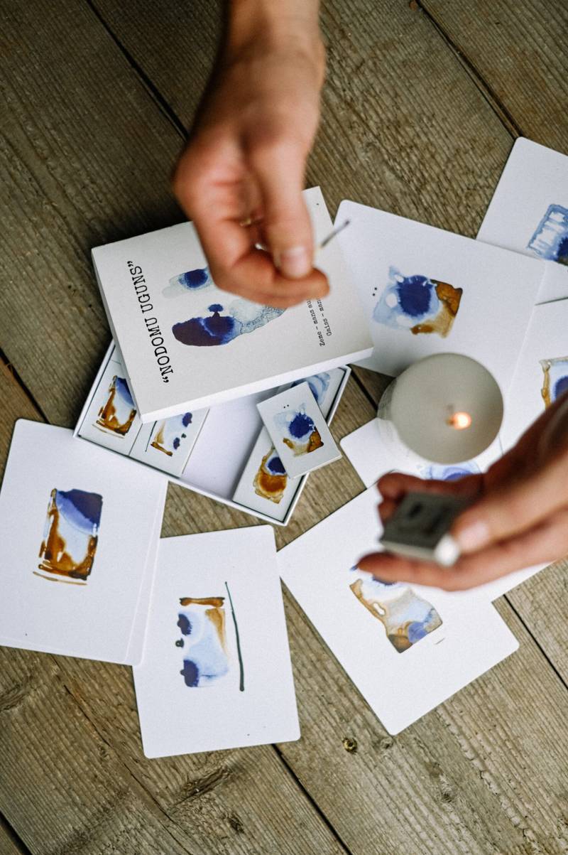 Ļaujies savai zemapziņai, izvēloties kādu no sajūtu gleznām uz sērkociņu kastītes.Kastītes aizmugurē atradīsi dainu, kuras vēstījums izlasāms uz skaidrojošās kartītes. Aizdedzini sveci, kamīnu vai ugunskuru un ļauj Nodomu ugunij piepildīt lauku, kurā savu realitāti radi. Un iespējams paies dienas, nedēļas, varbūt pat gadi un Tu sapratīsi, ka tieši Tu savu dzīvi vadi.
